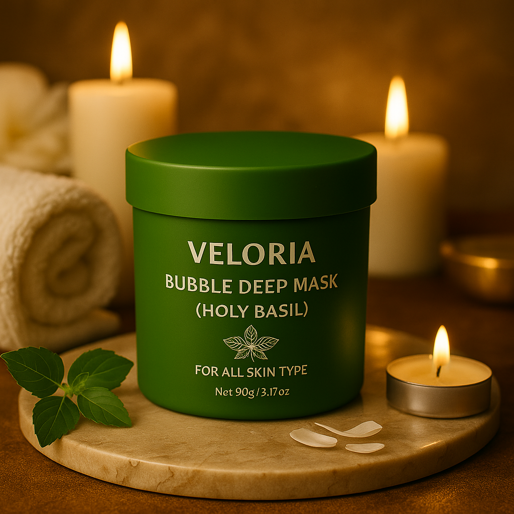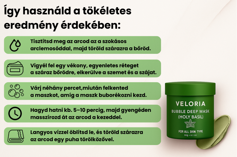 Fedezd fel a Veloria Bubble Deep Mask erejét, amely már az első használat után láthatóan tisztábbá, frissebbé és üdébbé varázsolja a bőröd. A szent bazsalikommal gazdagított formula mélyen tisztít, miközben nyugtatja az irritált bőrt, így természetes ragyogást és egységes tónust biztosít.