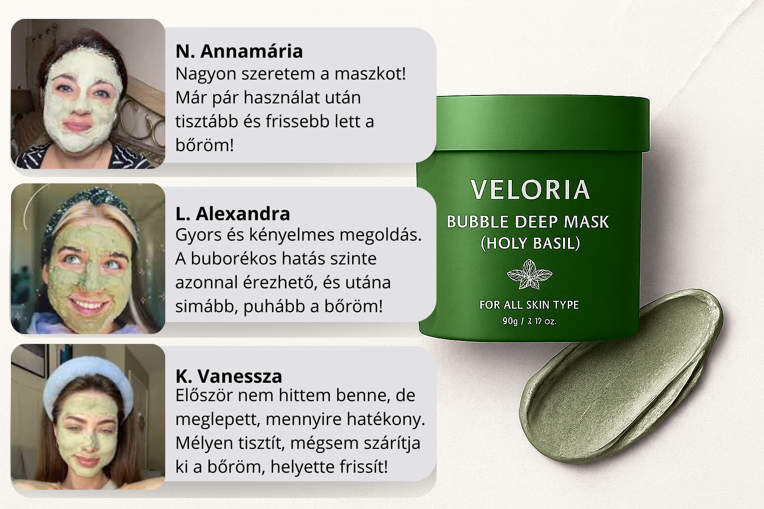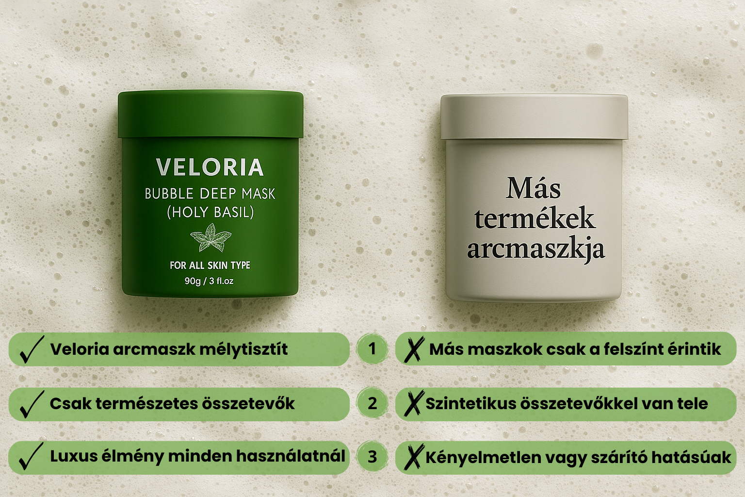 Klinikailag igazolt hatékonyság: a Veloria Bubble Deep Mask már egyetlen használat után akár 54%-kal csökkenti a mitesszerek számát és 44%-kal mérsékli a faggyútermelést. Innovatív buborékos textúrája mélyen behatol a pórusokba, eltávolítja a szennyeződéseket és védelmet nyújt a mindennapi stressz ellen.